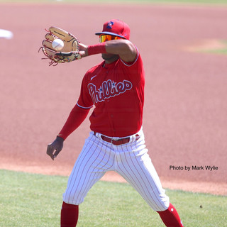 Before every baseball game this spring we’ve noticed that Didi Gregorius plays another game with teammates to warm up. They pass the baseball around using only their gloves to flip it to one another. Whenever one of the players misses the ball the others in the group gather around and “karate chop” him on the head 🤓. We’ve seen Didi play this game with Ronald Torreyes, Luis Garcia, Jean Segura and Bryson Stott. At a recent game Mark Wylie caught some great photos of the “Hot Potato” game.